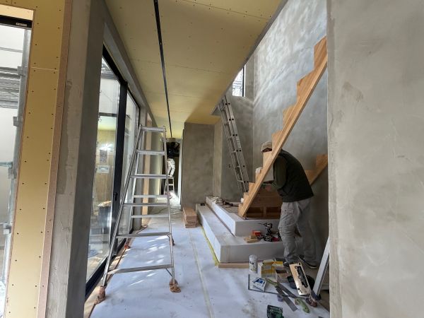 左官工事が完了し階段の造作に取り掛かりました。