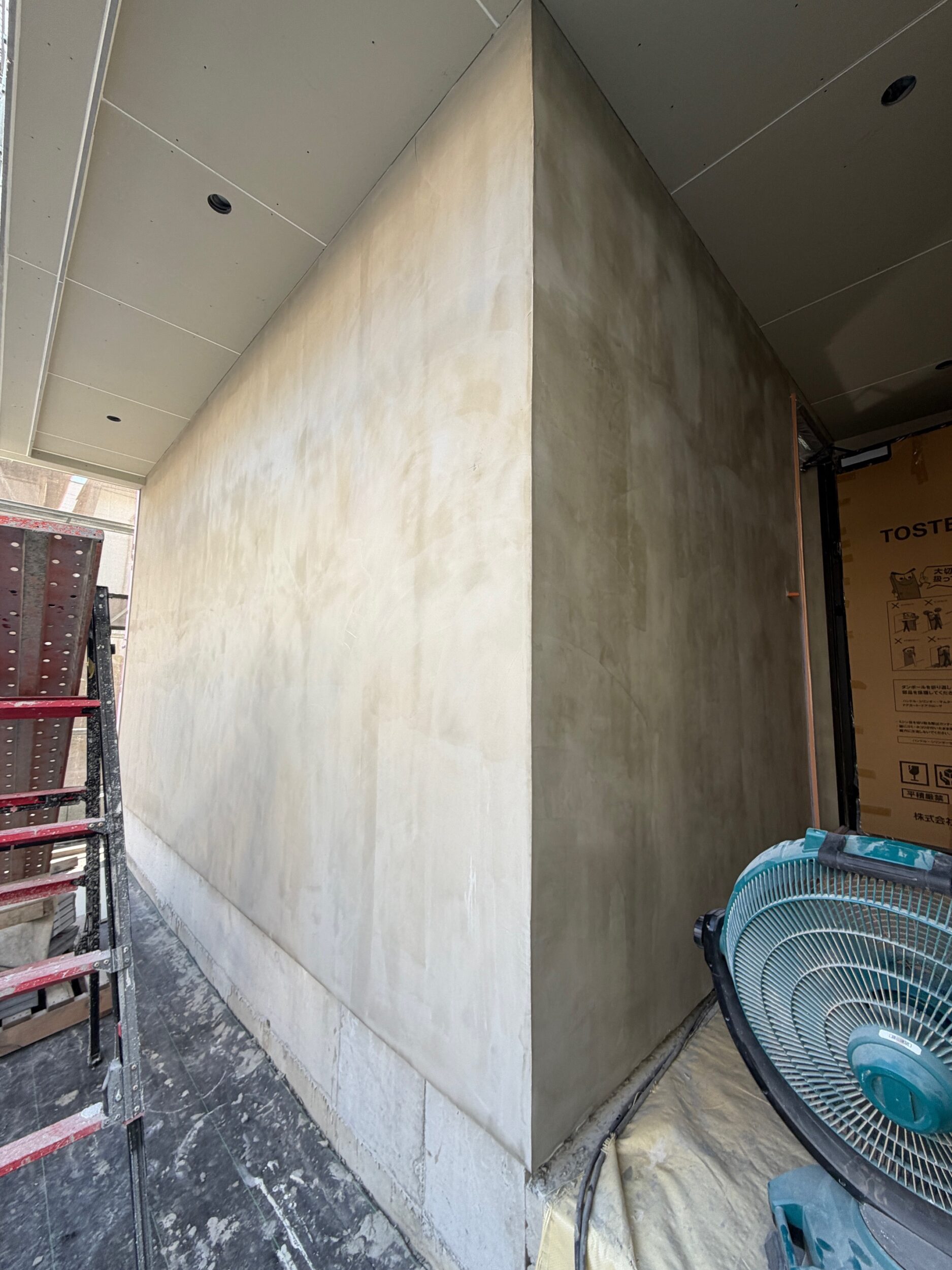 先週仕上がったモルタル外壁をクリア塗装で仕上げていきます。