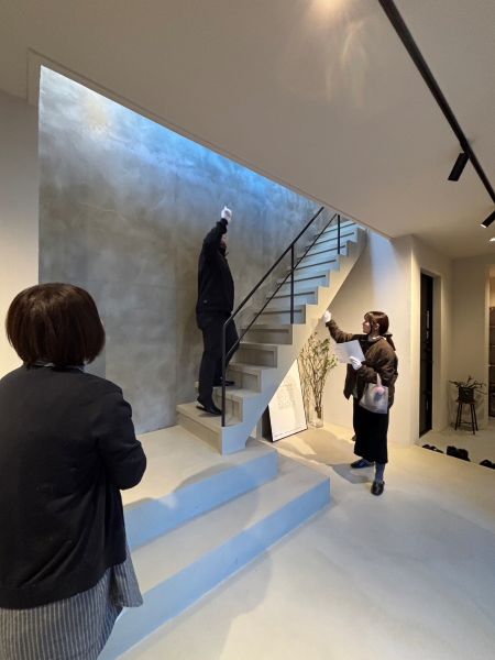 ホールから階段へと連なるグレージュのモールテックス。
