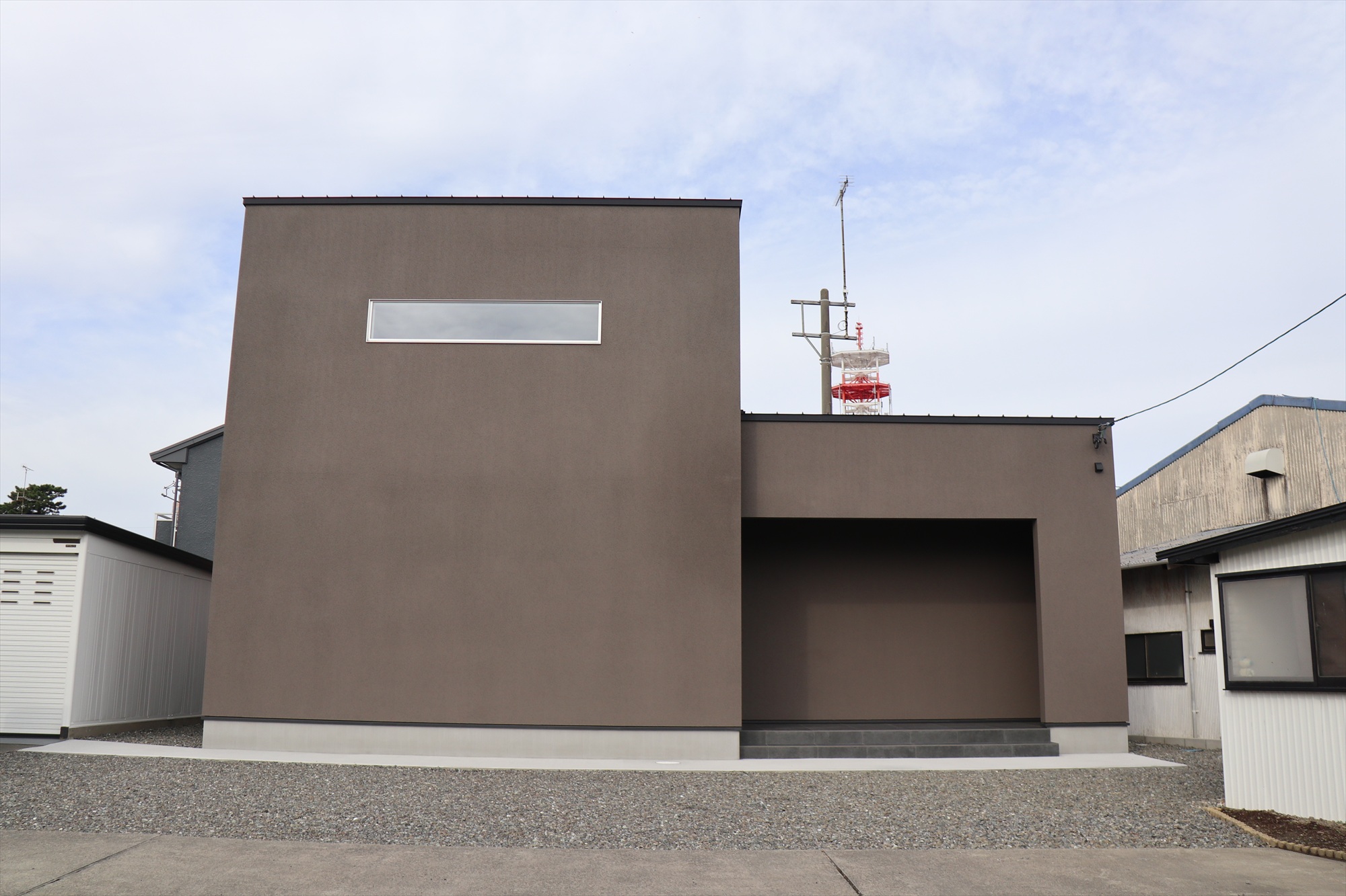 落ち着いたグレージュの塗装と直線的なデザインが印象的な外観。