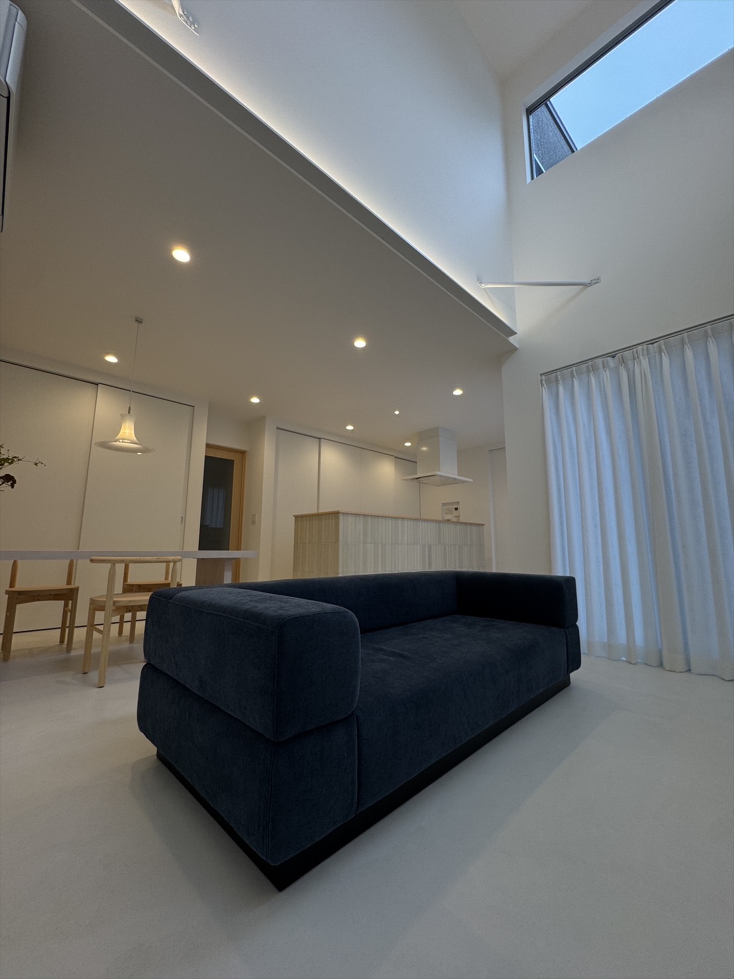 リビングの吹き抜けは高さを利用して間接照明を施し